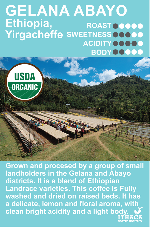 Grown and processed by a group of small landholders in the Gelana and Abayo districts. It is a blend of Ethiopian Landrace varieties. This coffee is fully washed and dried ond raised beds. It has a delicate lemon and floral aroma, with clean bright acidity and a light body.